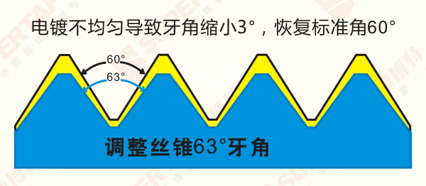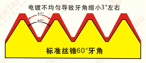 經(jīng)過(guò)改變絲錐的牙形角度,施工出來(lái)的牙角度變大,電鍍以后,角度變小,恢復(fù)到標(biāo)準(zhǔn)角度。