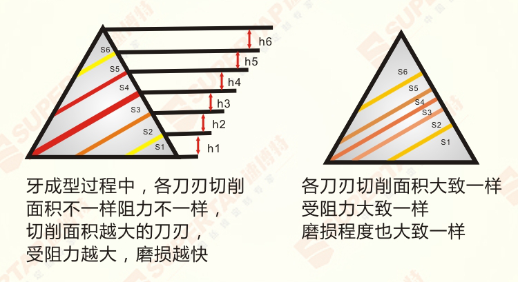 讓絲錐在攻牙的過(guò)程中,盡量保持每一個(gè)刀刃的鐵血面積都是相等的,均衡各個(gè)刀刃的阻力。使個(gè)刀刃的磨損程度幾乎達(dá)到一致,更大限量的利用刀刃。也就是說(shuō),當(dāng)有一個(gè)刀刃因?yàn)槟p而崩牙的時(shí)候,其他的刀刃也磨損的差不多了。最大程度的利用了各刀刃的切削量。